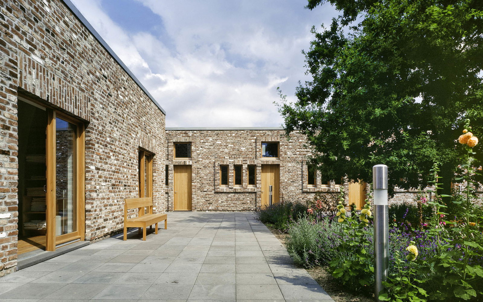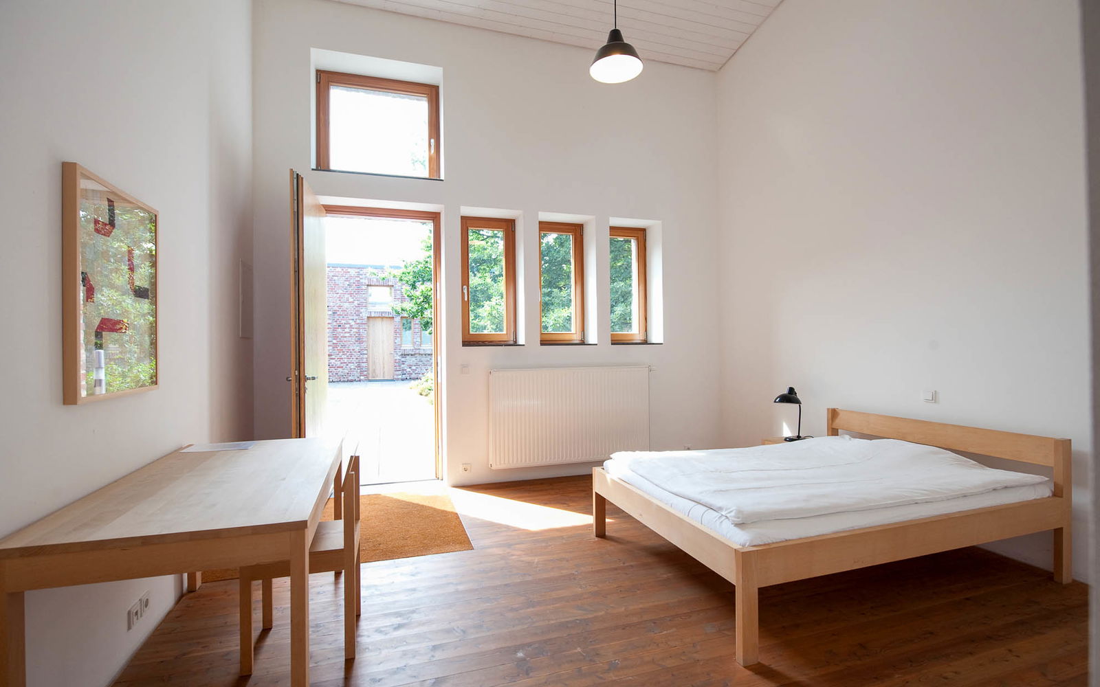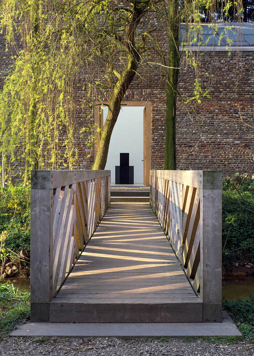 Den Schlüssel für die vier hölzernen Tore, die auf den H-förmigen Innenhof führen, holen sich die Gäste während der Öffnungszeiten im Kassenhaus des Museums Insel Hombroich. Sie öffnen auch die überhohen Schlafräume: Erwin Heerichs Sohn Martin setzte als Architekt den gewohnt radikalen, reduzierten Entwurf seines Vaters um.