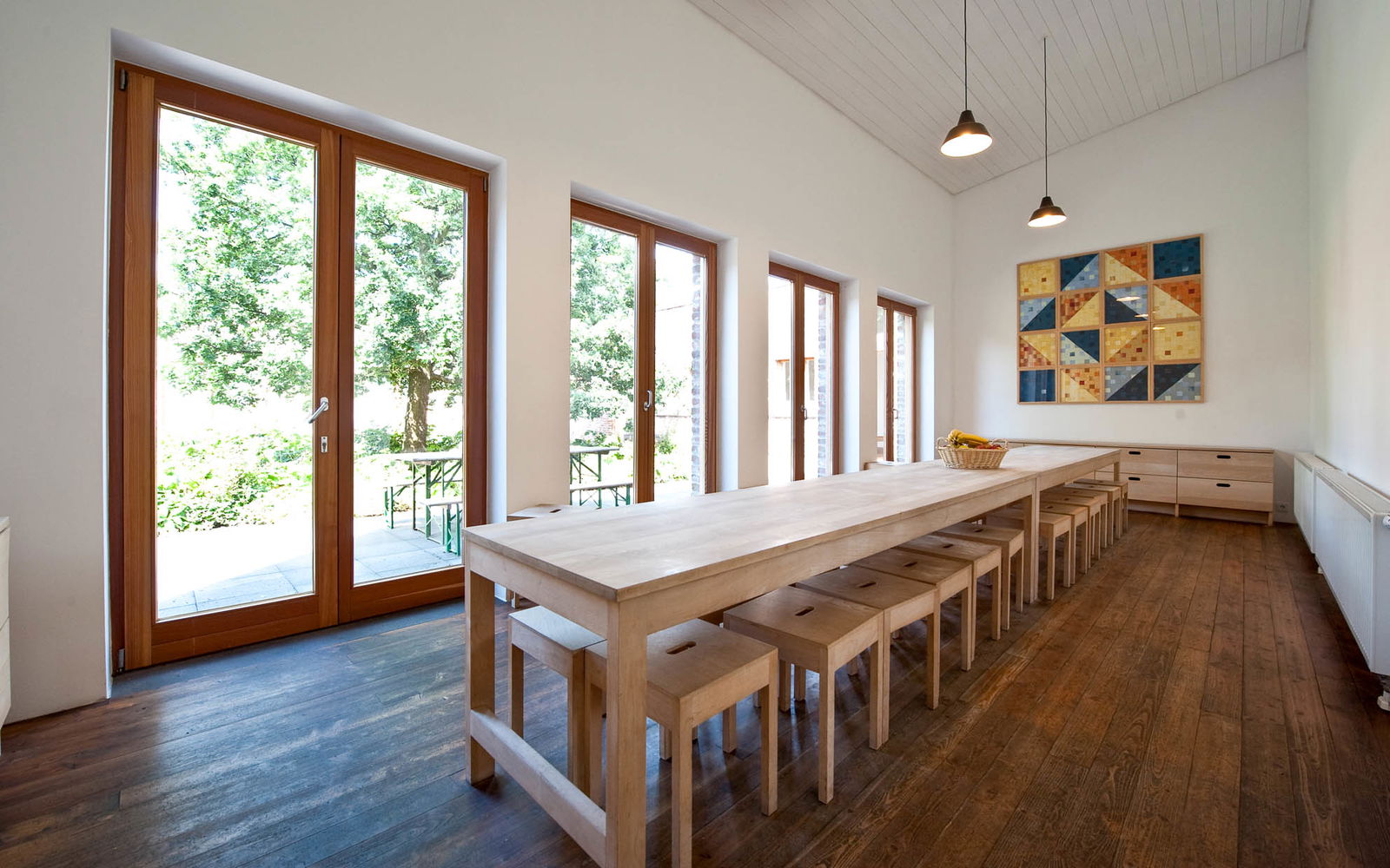 WLAN ist ein Zugeständnis an die heutigen Ansprüche, ebenso wie der nachträglich konzipierte halbhohe Sicht- und Lichtschutz, der bei Bedarf aus dem Schrank geholt und an den Fenstern angebracht werden kann. Angemessen karg gestaltete der Künstler und Vorstandsvorsitzende der Stiftung, Oliver Kruse, die Einrichtung, die textilen Interpretationen des Grundrisses an den weißen Wänden stammen von Erwin Heerichs Frau Hildegard. Die große Küche für die Selbstverpflegung steht allen Gästen zur Verfügung. Sie ist der rechte Ort, um sich lautstark über die Stille der Kulturlandschaft und die Rätsel der Kunst auszutauschen. Und sicher auch – ein wenig erschöpft, aber großartig beschenkt – anzustoßen auf einen Erfahrungsraum, der alle Sinne belebt.