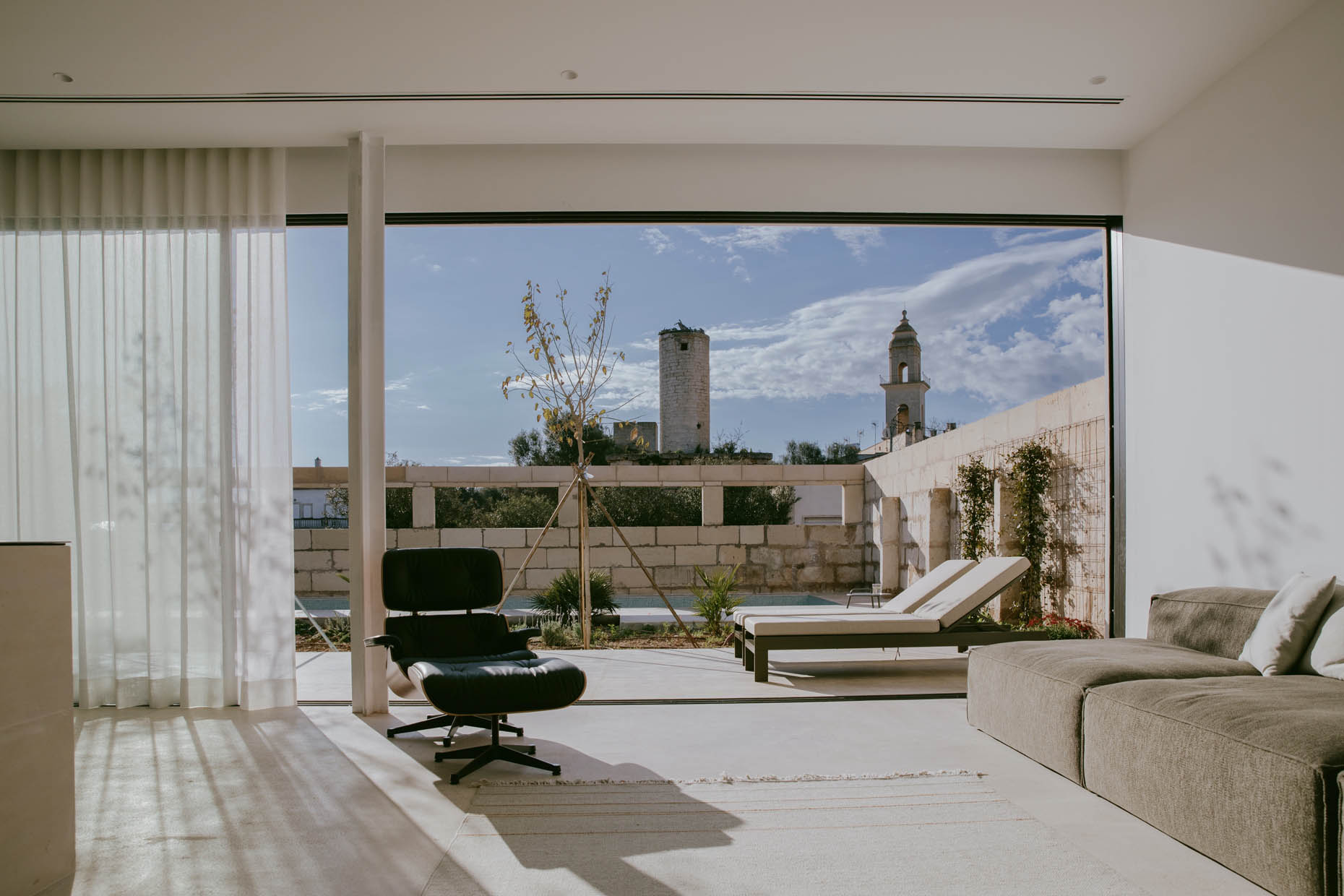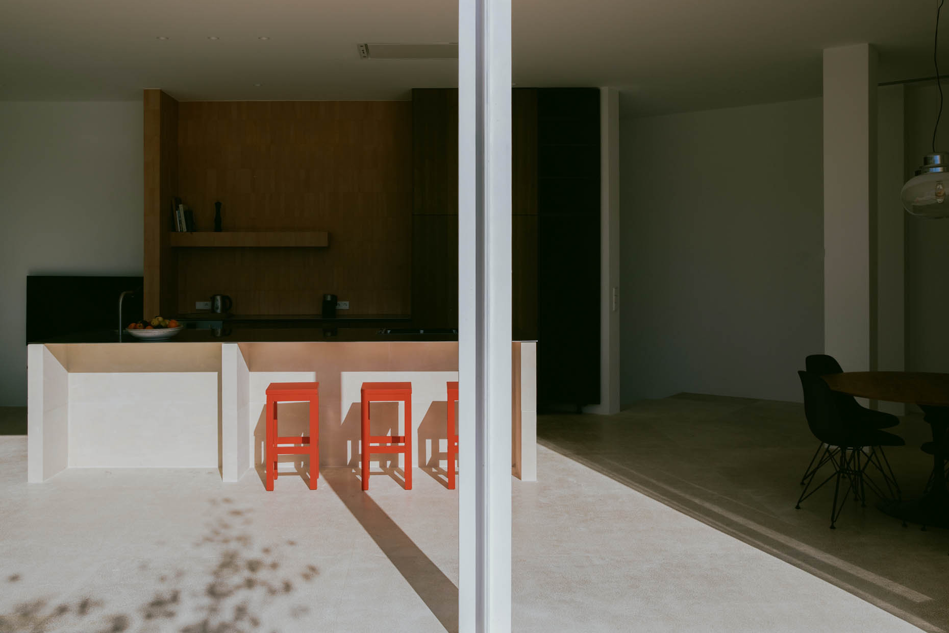 Inside the house, materials such as Marès stone, smoked oak, white surfaces and design classics underline the concept of simple elegance. Only the red stools, the brown tones and the pastel-coloured evening light stand out against the white walls – as if the salt pans were a box of colours that are being remixed in Casa Esperança.
