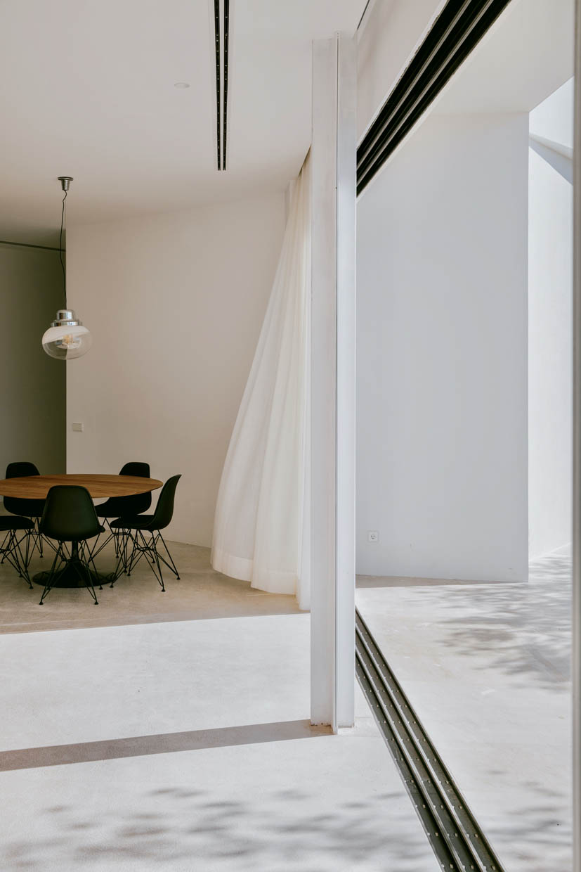 While the house presents a deliberately restrained and closed exterior, it opens up to the south onto a long saltwater pool and a garden with an old olive tree and Mediterranean plants.