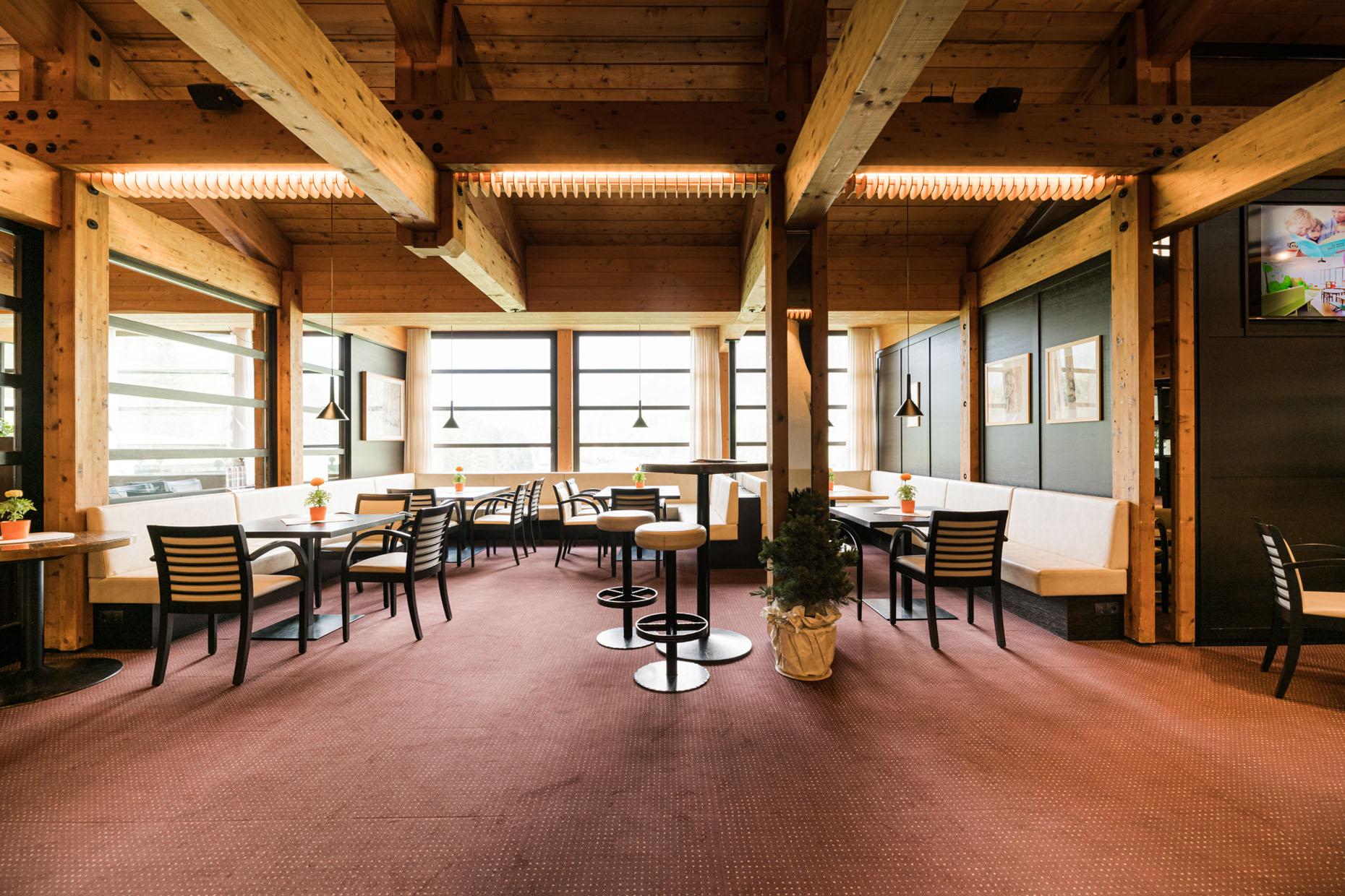 At the time, in the mid-1970s, it was one of the earlier examples of timber construction in hotel architecture, and the hall still derives its character from this glulam structure, with its unique atmosphere and sculptural stove.