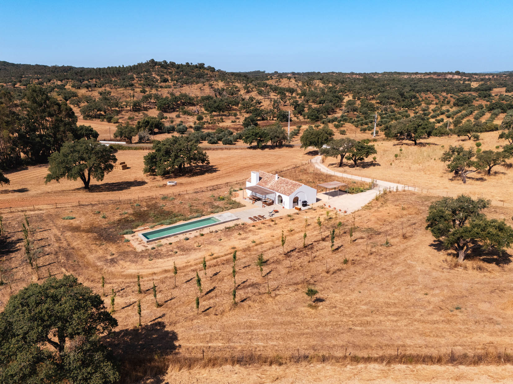 Gentle hills with cork oaks, pines and olive trees characterise the Alentejo hinterland. In the midst of this Arcadian landscape sits Monte de Santiago – formerly a traditional farmhouse – surrounded by 16 hectares of private land that merges seamlessly into the green expanse.